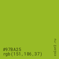 Цвет #97BA25 в цветовой модели RGB обозначается тремя октетами (151, 186, 37) в десятичном формате и #97BA25 в шестнадцатиричном (hex) формате, которые являются интенсивностью красного 151 (hex 97), интенсивность зелёного 186 (hex BA) и интенсивность синего 37 (hex 25).