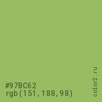 Цвет #97BC62 в цветовой модели RGB обозначается тремя октетами (151, 188, 98) в десятичном формате и #97BC62 в шестнадцатиричном (hex) формате, которые являются интенсивностью красного 151 (hex 97), интенсивность зелёного 188 (hex BC) и интенсивность синего 98 (hex 62).