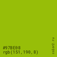 Цвет #97BE08 в цветовой модели RGB обозначается тремя октетами (151, 190, 8) в десятичном формате и #97BE08 в шестнадцатиричном (hex) формате, которые являются интенсивностью красного 151 (hex 97), интенсивность зелёного 190 (hex BE) и интенсивность синего 8 (hex 08).