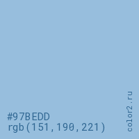 Цвет #97BEDD в цветовой модели RGB обозначается тремя октетами (151, 190, 221) в десятичном формате и #97BEDD в шестнадцатиричном (hex) формате, которые являются интенсивностью красного 151 (hex 97), интенсивность зелёного 190 (hex BE) и интенсивность синего 221 (hex DD).