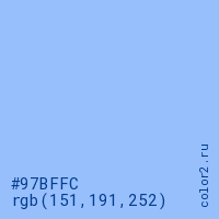 Цвет #97BFFC в цветовой модели RGB обозначается тремя октетами (151, 191, 252) в десятичном формате и #97BFFC в шестнадцатиричном (hex) формате, которые являются интенсивностью красного 151 (hex 97), интенсивность зелёного 191 (hex BF) и интенсивность синего 252 (hex FC).