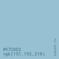 Цвет #97C0D2 в цветовой модели RGB обозначается тремя октетами (151, 192, 210) в десятичном формате и #97C0D2 в шестнадцатиричном (hex) формате, которые являются интенсивностью красного 151 (hex 97), интенсивность зелёного 192 (hex C0) и интенсивность синего 210 (hex D2).