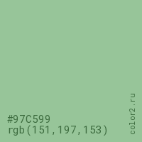 Цвет #97C599 в цветовой модели RGB обозначается тремя октетами (151, 197, 153) в десятичном формате и #97C599 в шестнадцатиричном (hex) формате, которые являются интенсивностью красного 151 (hex 97), интенсивность зелёного 197 (hex C5) и интенсивность синего 153 (hex 99).