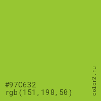 Цвет #97C632 в цветовой модели RGB обозначается тремя октетами (151, 198, 50) в десятичном формате и #97C632 в шестнадцатиричном (hex) формате, которые являются интенсивностью красного 151 (hex 97), интенсивность зелёного 198 (hex C6) и интенсивность синего 50 (hex 32).