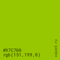 Цвет #97C700 в цветовой модели RGB обозначается тремя октетами (151, 199, 0) в десятичном формате и #97C700 в шестнадцатиричном (hex) формате, которые являются интенсивностью красного 151 (hex 97), интенсивность зелёного 199 (hex C7) и интенсивность синего 0 (hex 00).