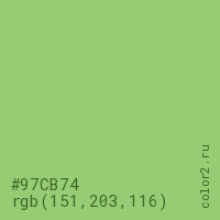 Цвет #97CB74 в цветовой модели RGB обозначается тремя октетами (151, 203, 116) в десятичном формате и #97CB74 в шестнадцатиричном (hex) формате, которые являются интенсивностью красного 151 (hex 97), интенсивность зелёного 203 (hex CB) и интенсивность синего 116 (hex 74).