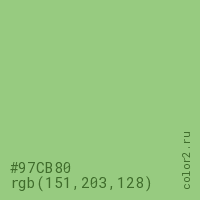 Цвет #97CB80 в цветовой модели RGB обозначается тремя октетами (151, 203, 128) в десятичном формате и #97CB80 в шестнадцатиричном (hex) формате, которые являются интенсивностью красного 151 (hex 97), интенсивность зелёного 203 (hex CB) и интенсивность синего 128 (hex 80).