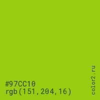 Цвет #97CC10 в цветовой модели RGB обозначается тремя октетами (151, 204, 16) в десятичном формате и #97CC10 в шестнадцатиричном (hex) формате, которые являются интенсивностью красного 151 (hex 97), интенсивность зелёного 204 (hex CC) и интенсивность синего 16 (hex 10).