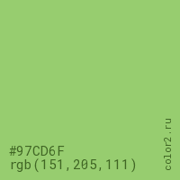 Цвет #97CD6F в цветовой модели RGB обозначается тремя октетами (151, 205, 111) в десятичном формате и #97CD6F в шестнадцатиричном (hex) формате, которые являются интенсивностью красного 151 (hex 97), интенсивность зелёного 205 (hex CD) и интенсивность синего 111 (hex 6F).
