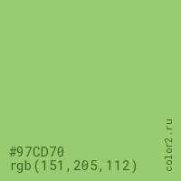 Цвет #97CD70 в цветовой модели RGB обозначается тремя октетами (151, 205, 112) в десятичном формате и #97CD70 в шестнадцатиричном (hex) формате, которые являются интенсивностью красного 151 (hex 97), интенсивность зелёного 205 (hex CD) и интенсивность синего 112 (hex 70).