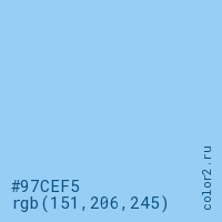 Цвет #97CEF5 в цветовой модели RGB обозначается тремя октетами (151, 206, 245) в десятичном формате и #97CEF5 в шестнадцатиричном (hex) формате, которые являются интенсивностью красного 151 (hex 97), интенсивность зелёного 206 (hex CE) и интенсивность синего 245 (hex F5).