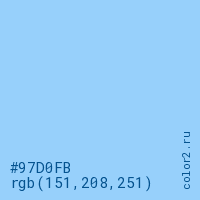 Цвет #97D0FB в цветовой модели RGB обозначается тремя октетами (151, 208, 251) в десятичном формате и #97D0FB в шестнадцатиричном (hex) формате, которые являются интенсивностью красного 151 (hex 97), интенсивность зелёного 208 (hex D0) и интенсивность синего 251 (hex FB).