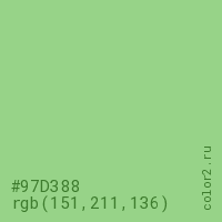 Цвет #97D388 в цветовой модели RGB обозначается тремя октетами (151, 211, 136) в десятичном формате и #97D388 в шестнадцатиричном (hex) формате, которые являются интенсивностью красного 151 (hex 97), интенсивность зелёного 211 (hex D3) и интенсивность синего 136 (hex 88).