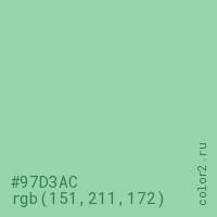 Цвет #97D3AC в цветовой модели RGB обозначается тремя октетами (151, 211, 172) в десятичном формате и #97D3AC в шестнадцатиричном (hex) формате, которые являются интенсивностью красного 151 (hex 97), интенсивность зелёного 211 (hex D3) и интенсивность синего 172 (hex AC).