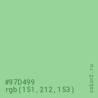 Цвет #97D499 в цветовой модели RGB обозначается тремя октетами (151, 212, 153) в десятичном формате и #97D499 в шестнадцатиричном (hex) формате, которые являются интенсивностью красного 151 (hex 97), интенсивность зелёного 212 (hex D4) и интенсивность синего 153 (hex 99).