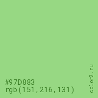 Цвет #97D883 в цветовой модели RGB обозначается тремя октетами (151, 216, 131) в десятичном формате и #97D883 в шестнадцатиричном (hex) формате, которые являются интенсивностью красного 151 (hex 97), интенсивность зелёного 216 (hex D8) и интенсивность синего 131 (hex 83).