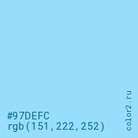 Цвет #97DEFC в цветовой модели RGB обозначается тремя октетами (151, 222, 252) в десятичном формате и #97DEFC в шестнадцатиричном (hex) формате, которые являются интенсивностью красного 151 (hex 97), интенсивность зелёного 222 (hex DE) и интенсивность синего 252 (hex FC).