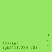 Цвет #97E662 в цветовой модели RGB обозначается тремя октетами (151, 230, 98) в десятичном формате и #97E662 в шестнадцатиричном (hex) формате, которые являются интенсивностью красного 151 (hex 97), интенсивность зелёного 230 (hex E6) и интенсивность синего 98 (hex 62).