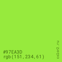 Цвет #97EA3D в цветовой модели RGB обозначается тремя октетами (151, 234, 61) в десятичном формате и #97EA3D в шестнадцатиричном (hex) формате, которые являются интенсивностью красного 151 (hex 97), интенсивность зелёного 234 (hex EA) и интенсивность синего 61 (hex 3D).