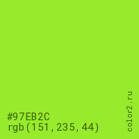 Цвет #97EB2C в цветовой модели RGB обозначается тремя октетами (151, 235, 44) в десятичном формате и #97EB2C в шестнадцатиричном (hex) формате, которые являются интенсивностью красного 151 (hex 97), интенсивность зелёного 235 (hex EB) и интенсивность синего 44 (hex 2C).
