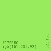Цвет #97EB5C в цветовой модели RGB обозначается тремя октетами (151, 235, 92) в десятичном формате и #97EB5C в шестнадцатиричном (hex) формате, которые являются интенсивностью красного 151 (hex 97), интенсивность зелёного 235 (hex EB) и интенсивность синего 92 (hex 5C).