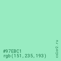 Цвет #97EBC1 в цветовой модели RGB обозначается тремя октетами (151, 235, 193) в десятичном формате и #97EBC1 в шестнадцатиричном (hex) формате, которые являются интенсивностью красного 151 (hex 97), интенсивность зелёного 235 (hex EB) и интенсивность синего 193 (hex C1).