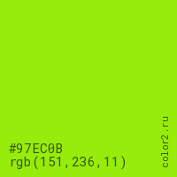 Цвет #97EC0B в цветовой модели RGB обозначается тремя октетами (151, 236, 11) в десятичном формате и #97EC0B в шестнадцатиричном (hex) формате, которые являются интенсивностью красного 151 (hex 97), интенсивность зелёного 236 (hex EC) и интенсивность синего 11 (hex 0B).