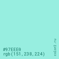 Цвет #97EEE0 в цветовой модели RGB обозначается тремя октетами (151, 238, 224) в десятичном формате и #97EEE0 в шестнадцатиричном (hex) формате, которые являются интенсивностью красного 151 (hex 97), интенсивность зелёного 238 (hex EE) и интенсивность синего 224 (hex E0).