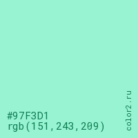 Цвет #97F3D1 в цветовой модели RGB обозначается тремя октетами (151, 243, 209) в десятичном формате и #97F3D1 в шестнадцатиричном (hex) формате, которые являются интенсивностью красного 151 (hex 97), интенсивность зелёного 243 (hex F3) и интенсивность синего 209 (hex D1).