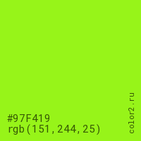 Цвет #97F419 в цветовой модели RGB обозначается тремя октетами (151, 244, 25) в десятичном формате и #97F419 в шестнадцатиричном (hex) формате, которые являются интенсивностью красного 151 (hex 97), интенсивность зелёного 244 (hex F4) и интенсивность синего 25 (hex 19).