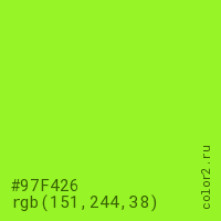Цвет #97F426 в цветовой модели RGB обозначается тремя октетами (151, 244, 38) в десятичном формате и #97F426 в шестнадцатиричном (hex) формате, которые являются интенсивностью красного 151 (hex 97), интенсивность зелёного 244 (hex F4) и интенсивность синего 38 (hex 26).