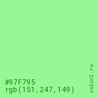 Цвет #97F795 в цветовой модели RGB обозначается тремя октетами (151, 247, 149) в десятичном формате и #97F795 в шестнадцатиричном (hex) формате, которые являются интенсивностью красного 151 (hex 97), интенсивность зелёного 247 (hex F7) и интенсивность синего 149 (hex 95).