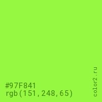 Цвет #97F841 в цветовой модели RGB обозначается тремя октетами (151, 248, 65) в десятичном формате и #97F841 в шестнадцатиричном (hex) формате, которые являются интенсивностью красного 151 (hex 97), интенсивность зелёного 248 (hex F8) и интенсивность синего 65 (hex 41).