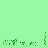Цвет #97FAA3 в цветовой модели RGB обозначается тремя октетами (151, 250, 163) в десятичном формате и #97FAA3 в шестнадцатиричном (hex) формате, которые являются интенсивностью красного 151 (hex 97), интенсивность зелёного 250 (hex FA) и интенсивность синего 163 (hex A3).