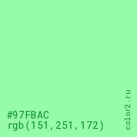 Цвет #97FBAC в цветовой модели RGB обозначается тремя октетами (151, 251, 172) в десятичном формате и #97FBAC в шестнадцатиричном (hex) формате, которые являются интенсивностью красного 151 (hex 97), интенсивность зелёного 251 (hex FB) и интенсивность синего 172 (hex AC).