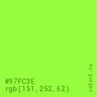 Цвет #97FC3E в цветовой модели RGB обозначается тремя октетами (151, 252, 62) в десятичном формате и #97FC3E в шестнадцатиричном (hex) формате, которые являются интенсивностью красного 151 (hex 97), интенсивность зелёного 252 (hex FC) и интенсивность синего 62 (hex 3E).