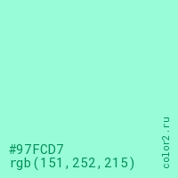 Цвет #97FCD7 в цветовой модели RGB обозначается тремя октетами (151, 252, 215) в десятичном формате и #97FCD7 в шестнадцатиричном (hex) формате, которые являются интенсивностью красного 151 (hex 97), интенсивность зелёного 252 (hex FC) и интенсивность синего 215 (hex D7).