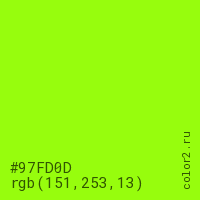 Цвет #97FD0D в цветовой модели RGB обозначается тремя октетами (151, 253, 13) в десятичном формате и #97FD0D в шестнадцатиричном (hex) формате, которые являются интенсивностью красного 151 (hex 97), интенсивность зелёного 253 (hex FD) и интенсивность синего 13 (hex 0D).