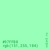 Цвет #97FFB8 в цветовой модели RGB обозначается тремя октетами (151, 255, 184) в десятичном формате и #97FFB8 в шестнадцатиричном (hex) формате, которые являются интенсивностью красного 151 (hex 97), интенсивность зелёного 255 (hex FF) и интенсивность синего 184 (hex B8).