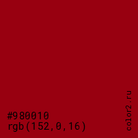 Цвет #980010 в цветовой модели RGB обозначается тремя октетами (152, 0, 16) в десятичном формате и #980010 в шестнадцатиричном (hex) формате, которые являются интенсивностью красного 152 (hex 98), интенсивность зелёного 0 (hex 00) и интенсивность синего 16 (hex 10).