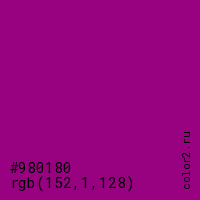 Цвет #980180 в цветовой модели RGB обозначается тремя октетами (152, 1, 128) в десятичном формате и #980180 в шестнадцатиричном (hex) формате, которые являются интенсивностью красного 152 (hex 98), интенсивность зелёного 1 (hex 01) и интенсивность синего 128 (hex 80).