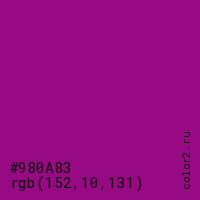 Цвет #980A83 в цветовой модели RGB обозначается тремя октетами (152, 10, 131) в десятичном формате и #980A83 в шестнадцатиричном (hex) формате, которые являются интенсивностью красного 152 (hex 98), интенсивность зелёного 10 (hex 0A) и интенсивность синего 131 (hex 83).