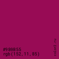 Цвет #980B55 в цветовой модели RGB обозначается тремя октетами (152, 11, 85) в десятичном формате и #980B55 в шестнадцатиричном (hex) формате, которые являются интенсивностью красного 152 (hex 98), интенсивность зелёного 11 (hex 0B) и интенсивность синего 85 (hex 55).