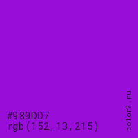 Цвет #980DD7 в цветовой модели RGB обозначается тремя октетами (152, 13, 215) в десятичном формате и #980DD7 в шестнадцатиричном (hex) формате, которые являются интенсивностью красного 152 (hex 98), интенсивность зелёного 13 (hex 0D) и интенсивность синего 215 (hex D7).