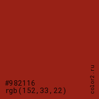 Цвет #982116 в цветовой модели RGB обозначается тремя октетами (152, 33, 22) в десятичном формате и #982116 в шестнадцатиричном (hex) формате, которые являются интенсивностью красного 152 (hex 98), интенсивность зелёного 33 (hex 21) и интенсивность синего 22 (hex 16).