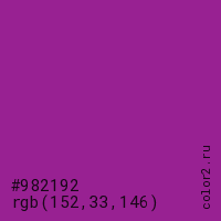 Цвет #982192 в цветовой модели RGB обозначается тремя октетами (152, 33, 146) в десятичном формате и #982192 в шестнадцатиричном (hex) формате, которые являются интенсивностью красного 152 (hex 98), интенсивность зелёного 33 (hex 21) и интенсивность синего 146 (hex 92).