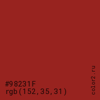 Цвет #98231F в цветовой модели RGB обозначается тремя октетами (152, 35, 31) в десятичном формате и #98231F в шестнадцатиричном (hex) формате, которые являются интенсивностью красного 152 (hex 98), интенсивность зелёного 35 (hex 23) и интенсивность синего 31 (hex 1F).