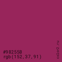 Цвет #98255B в цветовой модели RGB обозначается тремя октетами (152, 37, 91) в десятичном формате и #98255B в шестнадцатиричном (hex) формате, которые являются интенсивностью красного 152 (hex 98), интенсивность зелёного 37 (hex 25) и интенсивность синего 91 (hex 5B).