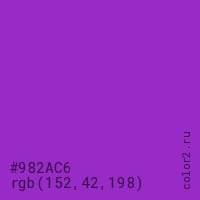 Цвет #982AC6 в цветовой модели RGB обозначается тремя октетами (152, 42, 198) в десятичном формате и #982AC6 в шестнадцатиричном (hex) формате, которые являются интенсивностью красного 152 (hex 98), интенсивность зелёного 42 (hex 2A) и интенсивность синего 198 (hex C6).