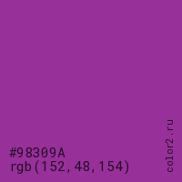 Цвет #98309A в цветовой модели RGB обозначается тремя октетами (152, 48, 154) в десятичном формате и #98309A в шестнадцатиричном (hex) формате, которые являются интенсивностью красного 152 (hex 98), интенсивность зелёного 48 (hex 30) и интенсивность синего 154 (hex 9A).